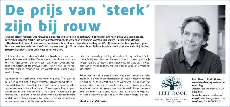 “Ik moet dit zelf kunnen.” Als rouwbegeleider hoor ik dit bijna dagelijks. Of het nu gaat om het verlies van een dierbare, het verlies van een relatie, het verlies van gezondheid, een baan of andere vormen van verlies. In een wereld waar zelfredzaamheid wordt bewonderd, voelen we de druk om rouw alleen te dragen. We bijten onze tanden op elkaar, gaan door met werken en horen hoe ‘sterk’ we wel niet zijn. Maar achter die schijnbare kracht schuilt vaak een valkuil: juist het alleen willen doen, houdt ons vast in het verdriet.